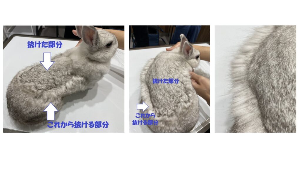 ウサギさんの換毛期は年に4-5回と言われており、その中でも冬毛から夏毛に変わる【春】、夏毛から冬毛に変わる【秋】がたくさんの毛が抜けます。抜けた毛を処理するために毛づくろいすることでたくさんの毛をお腹中に入れてしまいます。胃の中で毛玉となりそれが原因となり胃腸のうっ滞を引き起こすともいわれており一番身近な原因の一つと言えます。
