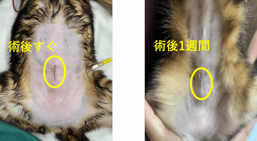 退院後は1週間後に傷口の確認をします。そして下の写真は避妊手術をした猫ちゃんの写真です。とてもキレイにくっついています!そしてすでに毛刈りした部分も毛が生えてきていますね。炎症もなく手術する前と変わらなくなってきています。うさぎさん同様抜糸はありません。