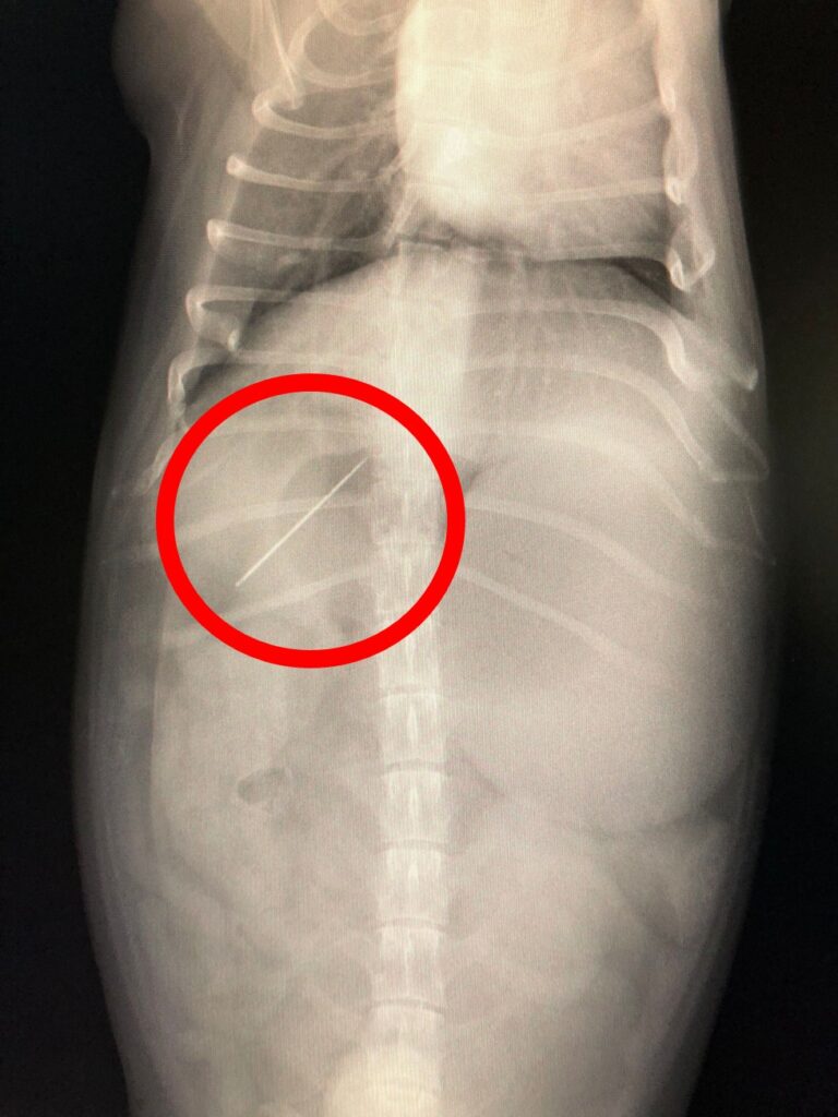 異物を飲み込んで間もない場合はまだ胃に留まっていることが多いので、催吐処置や内視鏡を使い摘出処置を行うことができますが、異物が尖っていたり、危険性があるものに関しては消化管穿孔の可能性があるので誤食してからすぐでも催吐処置をすることはできません。